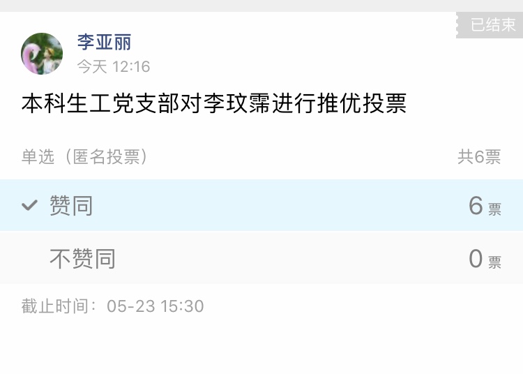 2020年5月23日,本科生工党支部于线上进行拟发展对象确定讨论会,会议由李亚丽主持。推优是高校选拔党员的主要途径,本次参加推优的候选人共一人,支部6名正式党员及3名预备党员全部参加会议。