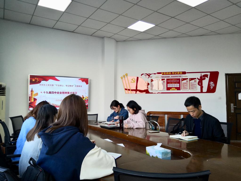 近期,中国共产党第十九届中央委员会第四次全体会议于北京举行。为深入学习会议要点,传达党的十九届四中全会精神,将会议精神内化于心、外化于行,11月22日下午,本科生物工程党支部于院楼召开全体党员会议,本次会议由李亚丽副书记主持。