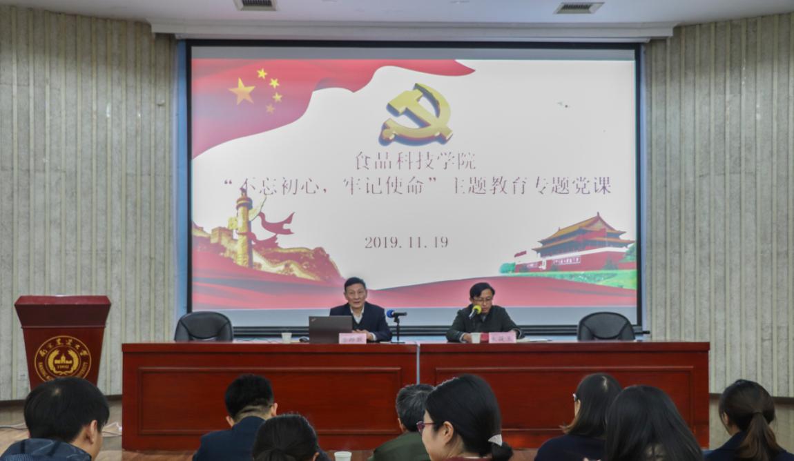 11月19日晚,bat365正版唯一官网“不忘初心、牢记使命”主题教育理论学习会在图书馆报告厅举行。原校党委副书记兼纪委书记盛邦跃教授受邀以“不忘初心、牢记使命,学习习近平新时代中国特色社会主义思想”为主题作报告。bat365正版唯一官网党委书记朱筱玉、院党委副书记邵士昌、食品院农产教工党支部书记潘磊庆、研究生辅导员王雪飞、本科生辅导员邵春妍、本科生兼职辅导员汪明佳及bat365正版唯一官网200余名学生参与本次报告会。报告会由朱筱玉主持。