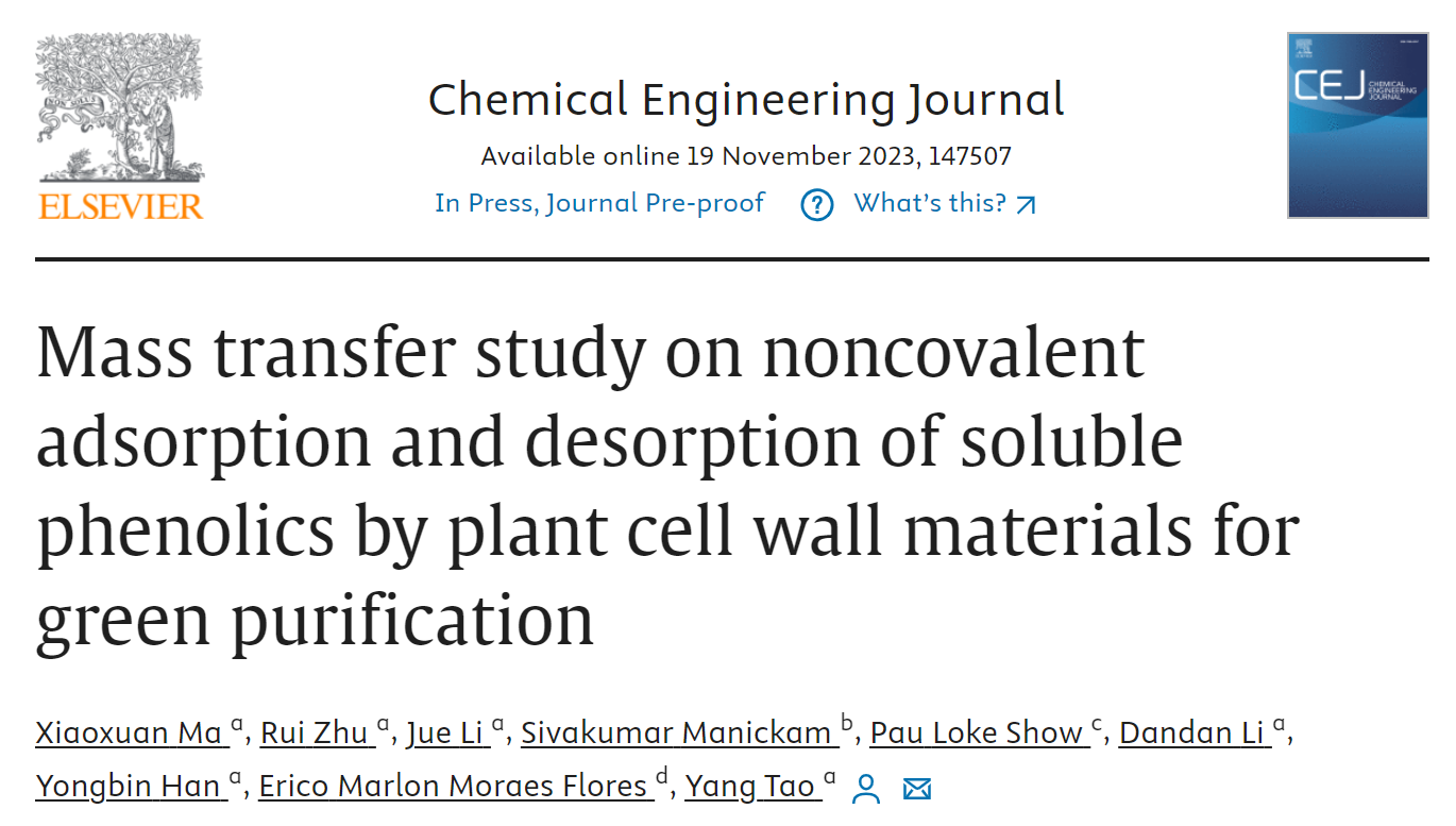 202311月,食品学院韩永斌、陶阳课题组在国际期刊Chemical Engineering Journal发表题为Mass transfer study on noncovalent adsorption and desorption of soluble phenolics by plant cell wall materials for green purification”的研究性论文。揭示了植物细胞壁材料非共价吸附/解离可溶性多酚的物理传质新机制,开发了可溶性多酚绿色纯化新技术。