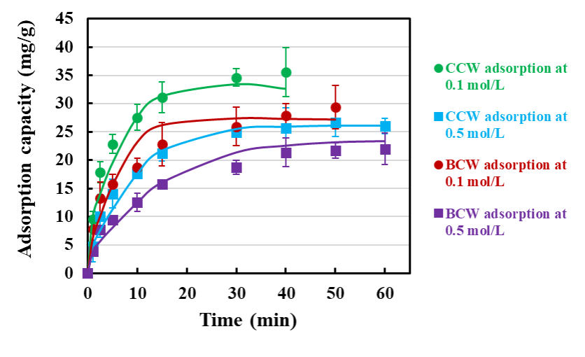1:不同环境离子强度下植物细胞壁材料对酚类物质的吸附动力学曲线